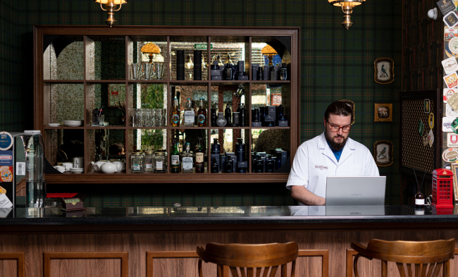 Уютный бар с различными напитками для членов The gentlemen Club , расположенный в зоне ожидания гостей.